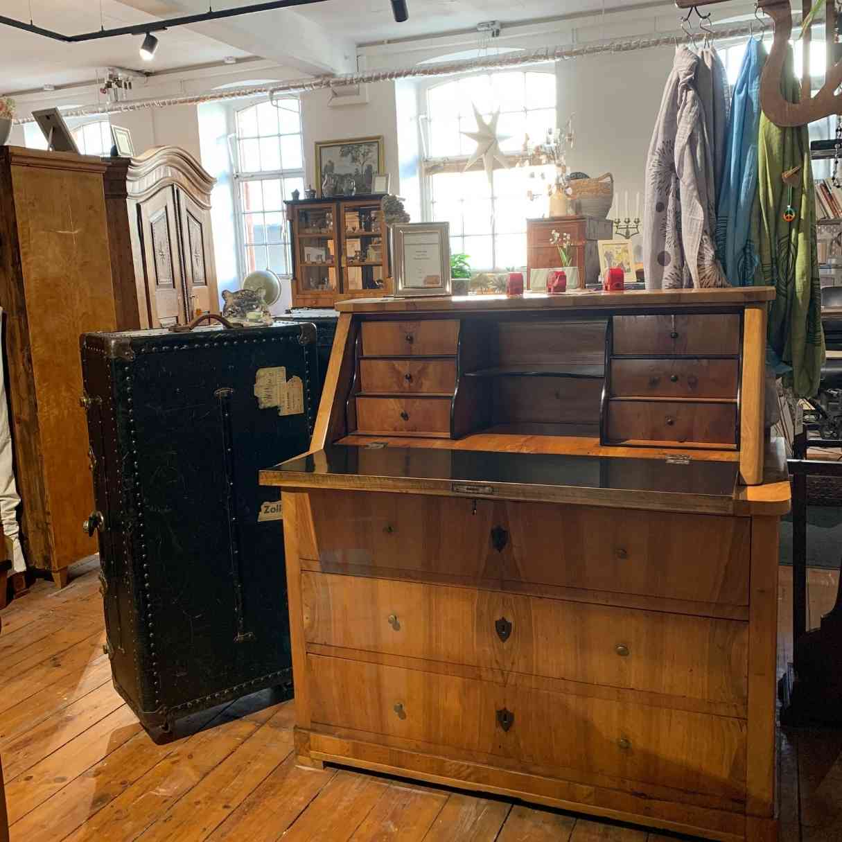 Biedermeier Schrägklappen-Sekretär Antiquitäten Antiquitätenhandel Antiquitätenfachgeschäft Antik Nachhaltigkeit Barock Biedermeier Jugendstil Empire Klassizismus Birke Esche Kirschbaum Nussbaum Eiche Mahagoni Weichholz Schrank Kleiderschrank Kommode Vertiko Stuhl Sessel Beistelltisch Gründerzeit Shabby Chic Vintage Design Accessoires Sekretär Tisch Schreibtisch Vasen Silber Versilbertes Kistchen Kästchen Schmuck Gemälde Skulpturen Biedermeier Schrägklappen-Sekretär