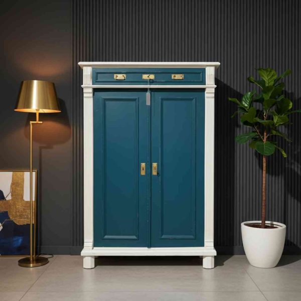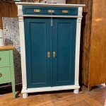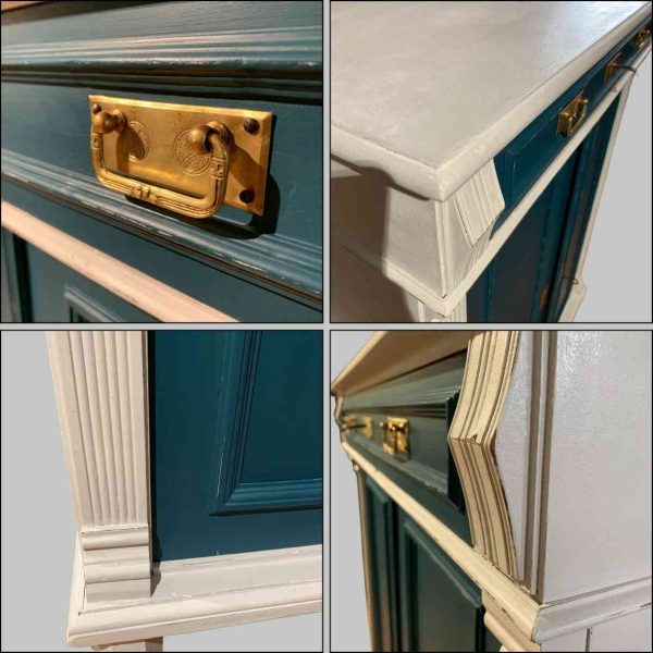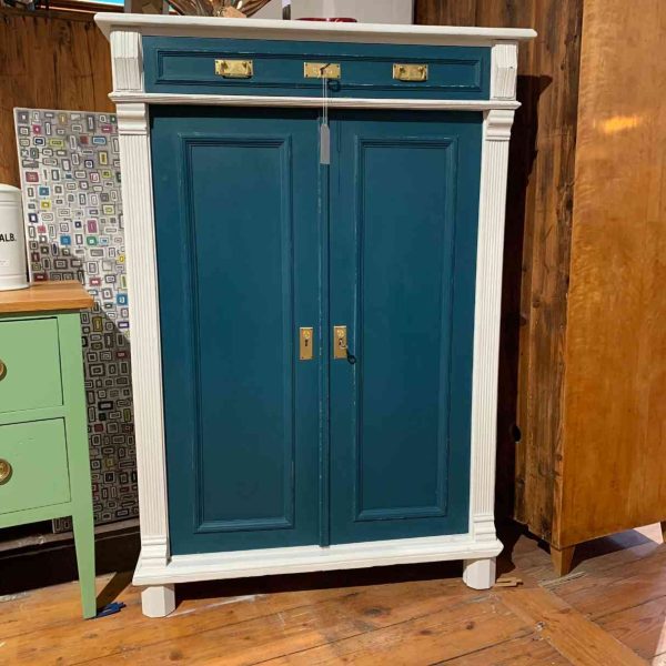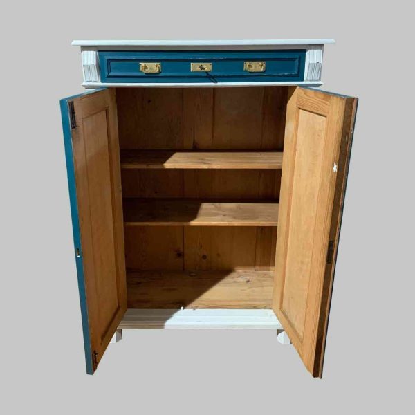 Bringt Farbe in die Bude. Vertiko im Shabby Chic in Weißgrau mit ozeanblauer Front. Praktisch ist es außerdem, kann doch vieles darin verschwinden.